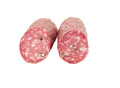 Schweinefleisch 44% (EU-Ursprung), Salz, Gewürze, Dextrose, Zucker, Geschmacksverstärker: Glutamat, Mononatrium, Antioxidationsmittel: Natriumasorbat, Konservierungsstoff: Kaliumnitrat, Gewürzextrakt, Rote-Rüben-Saftkonzentrat, Gewürzextrakt, Kartoffelfaser, Schweineprotein.